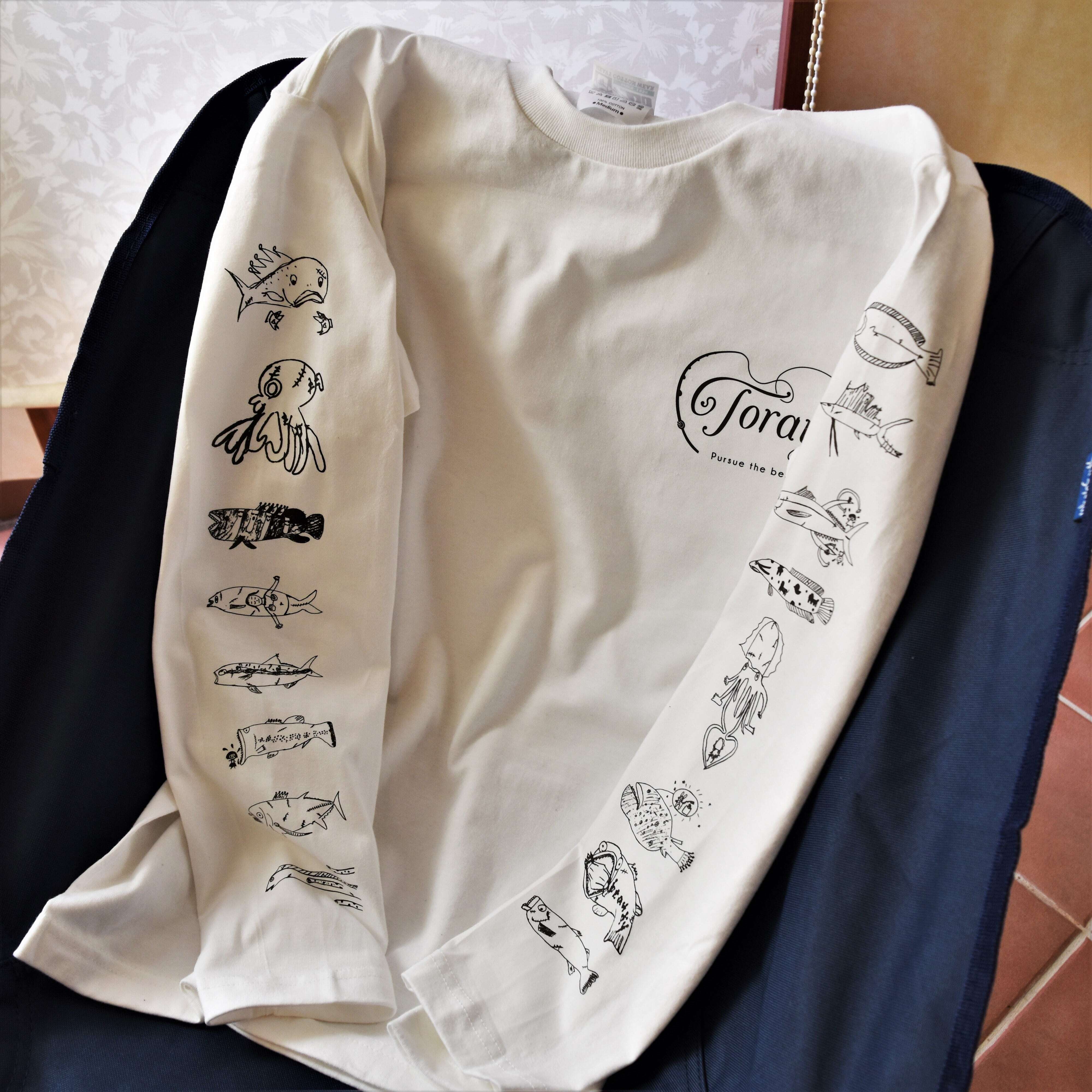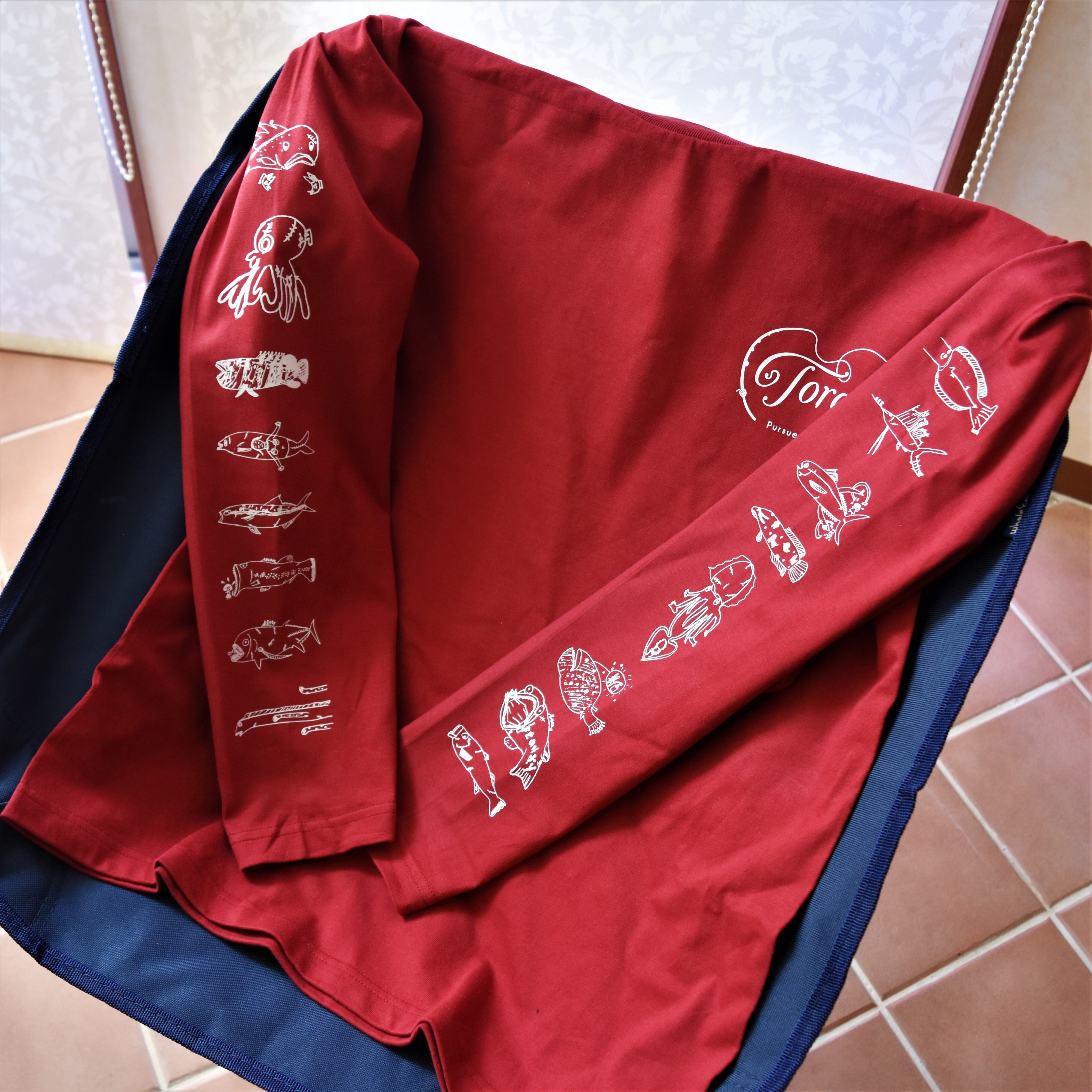 両袖にラフで可愛いらしい魚がプリントされた長袖Tシャツです。